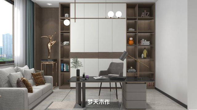 设计独立书房,承载业主的奇思妙想。放置书桌+沙发组合,约上三五好友畅谈生活理想,书房整墙的书柜,集收纳展示于一体,既起到了收纳的作用,又彰显了业主的品位。