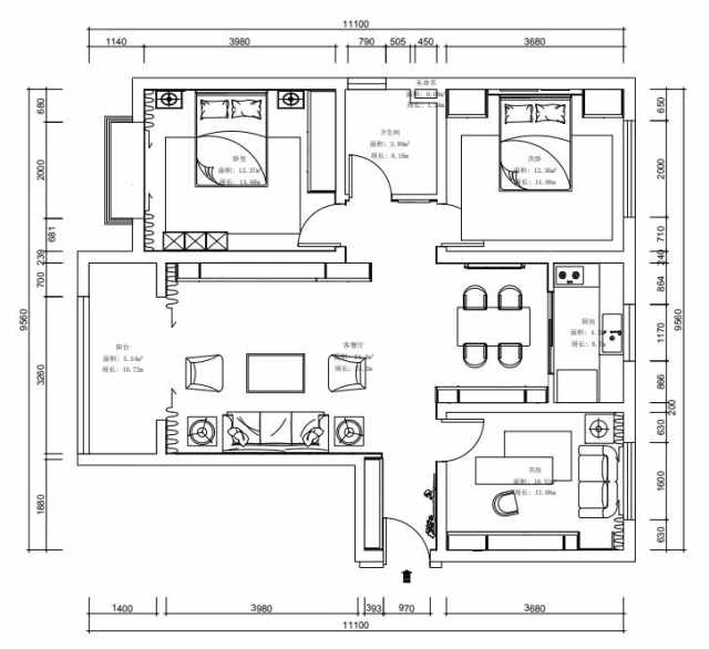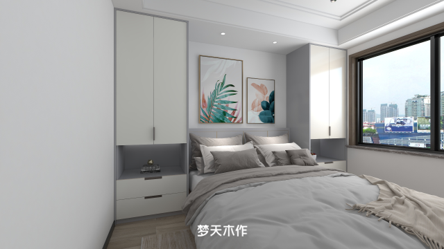次卧,取消两侧的床头柜,增添设计了两个通顶的衣柜,以便增加收纳空间。衣柜中下方,留空设计,方便就寝时可以随手放置手机,杯子等物件。