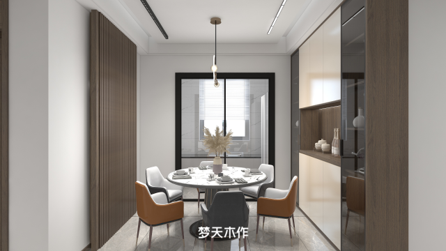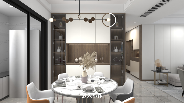 餐厅与客厅相连,半开放式餐边柜来“填充”墙面空间,让整个布局具备结构区域划分的同时又不显空荡。色调保持与客厅一致,金属元素与玻璃相结合,营造精致的就餐氛围,再以金属与大理石相结合的圆形餐桌,布艺的餐椅,优雅的餐边柜的组合方式,将餐厅打造为一个家庭用餐,聚会休憩的相处空间。