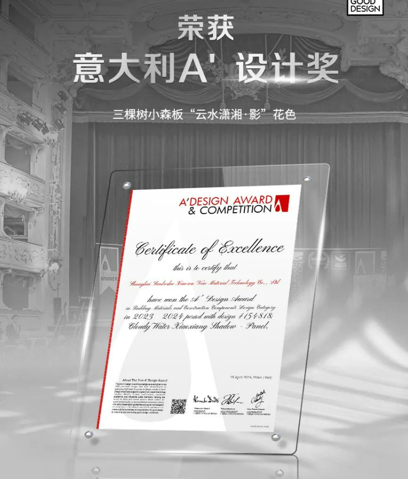 据了解,意大利A'设计奖是世界上规模最大、最负盛名、最具影响力的设计奖项之一,被誉为设计领域的最高荣誉之一。此次荣获了这项国际权威大奖的三棵树小森板“云水潇湘·影”花色,承袭了东方美学艺术的深厚底蕴,营造古典雅致的现代空间美学。