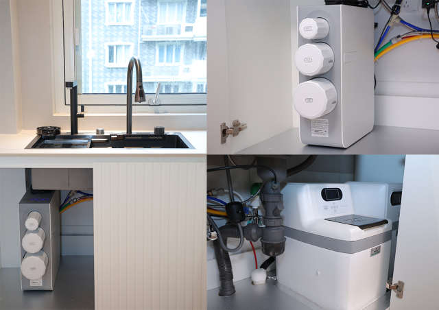 【疑难解决】通常,安装全屋净水设备需要单独的“设备间”。但Rachel夫妇家因空间面积有限,缺少这样的基础条件。得益于怡口丰富的产品线以及多种尺寸的产品型号选择,加上怡口净水安装团队的专业技术,顺利将怡口前置过滤器ESF105-M、云钻中央净水机710WHF 、云钻中央软水机710ECM和云钻全厨双出水净水器 ERO615-3组成的4件套,完美在橱柜的有限空间安装。不仅方便设备管理,也优化了管线布局,让每个设备充分发挥其功效,还能留出一部分操作空间,后期业主自己添加软水盐也非常方便,且依旧保留了其余空间供日常收纳使用。