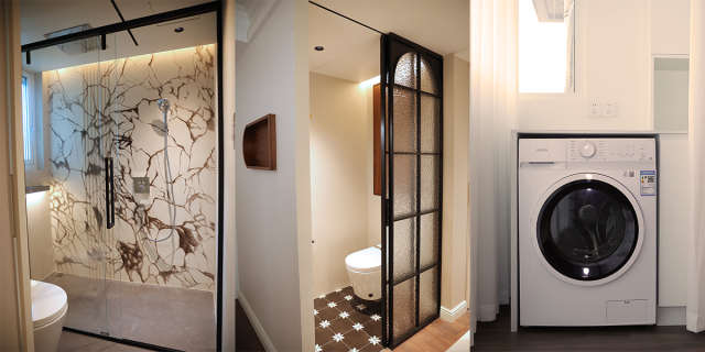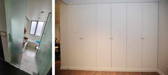 【增设衣帽间】:拆除主卧中不常用的卫生间,改造成衣帽间,扩大业主的储物空间,一门到顶的衣柜,充分满足夫妻二人的衣帽收纳需求。