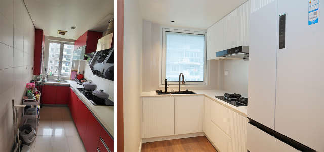 改造后,LDK(客餐厨)一体化的设计,联通了阳台、客厅、餐厅和厨房,大大提升了家中空间格局和利用率,贯穿的动线也让业主一家日常生活更方便自如;采光和通风也同步提升,整体视觉更开阔通透。
