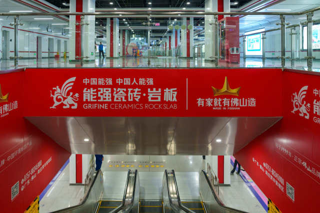 能强瓷砖本次在起点为佛山南庄终点至广州南站的佛山地铁2号线投放品牌广告,涵盖了多个热门线路,包括贯穿城市中心商业区、居民区以及交通枢纽等。