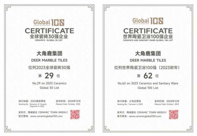 在全球化进程中,大角鹿不仅注重产品输出,更着眼于全球市场的深度融入。企业积极布局技术、产能、管理全链出海,推进海外属地化经营,不断提升品牌全球化运营能力。凭借着卓越的产品品质、先进的生产技术和全球化影响力,大角鹿成功上榜“世界陶瓷卫浴100强企业”“全球瓷砖30强企业”“全球瓷砖产量30强”,成为中国瓷砖出海的先锋力量,