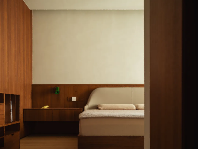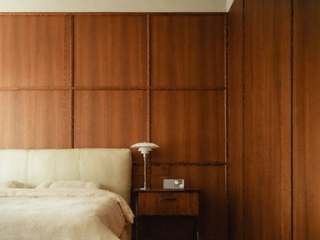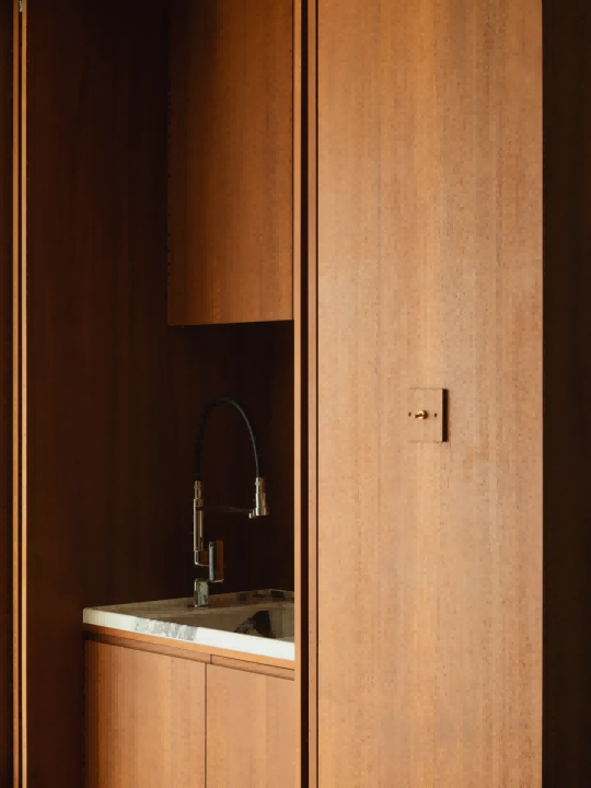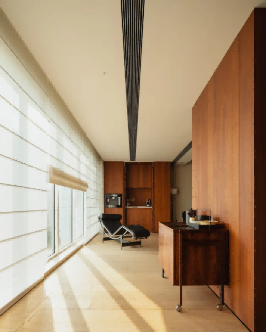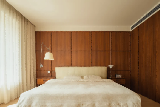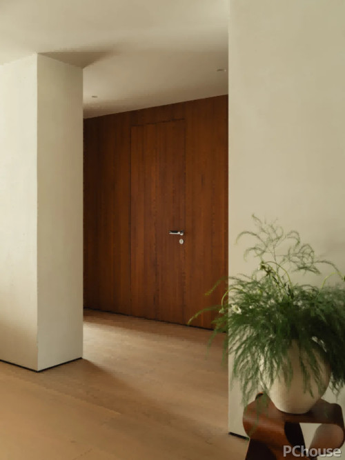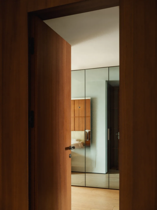 卧室区域隐匿于柔和白泥色墙后的柚木走廊内,在确保居住体验自然舒适的基础上,步入式衣帽间,宛如一座微型的时尚殿堂。