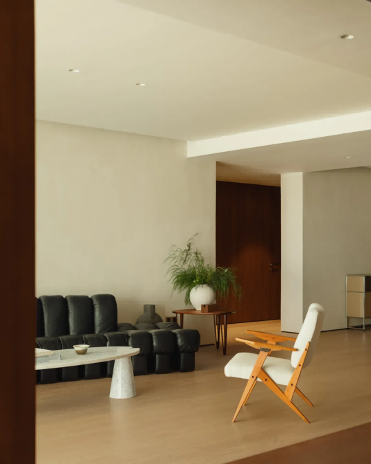 Angelo Mangiarotti设计的中古大理石茶几和来自巴西设计师Jose Zanine Caldas的中古木质扶手椅成为跳脱的亮点。