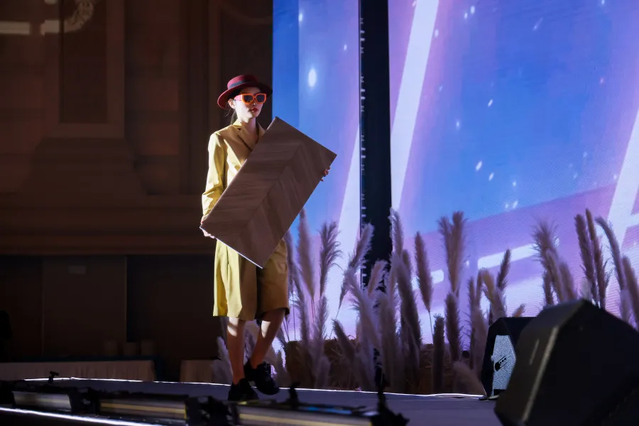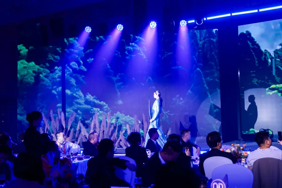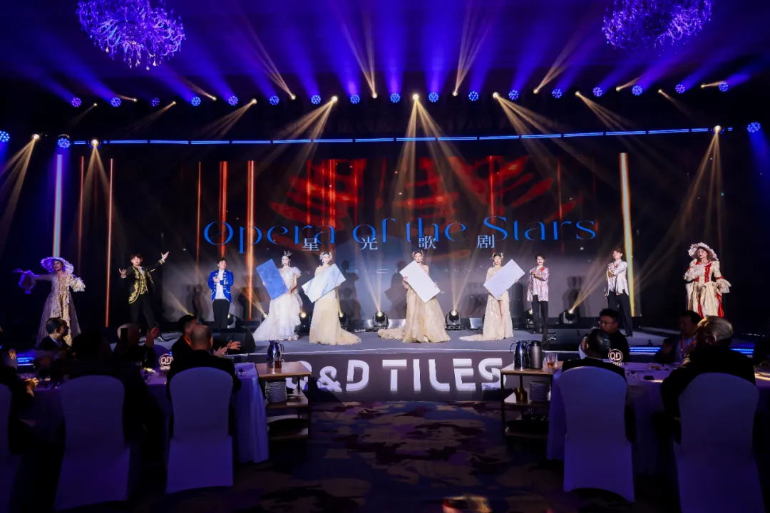 不仅是门店场景带来的沉浸式体验,值得一提的是,QD瓷砖在此次新品品鉴会现场亦营造了一场极具氛围感的视觉感官盛宴,以一个集产品、歌剧、灯光、音乐于一体的聚合场域,通过丰富、有趣、充满层次的视听盛宴,为现场经销商带来多维体验。