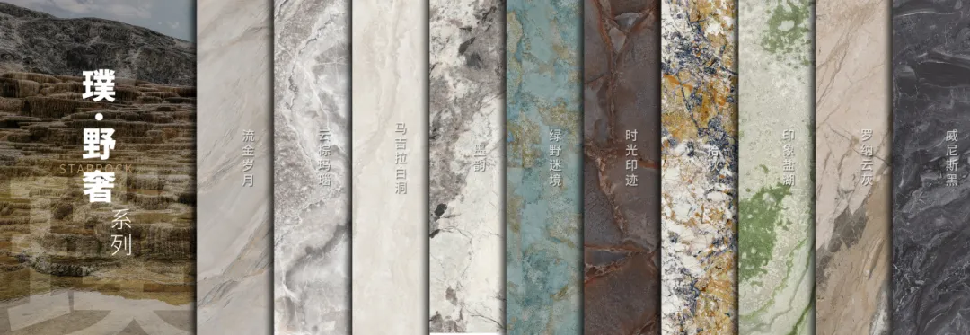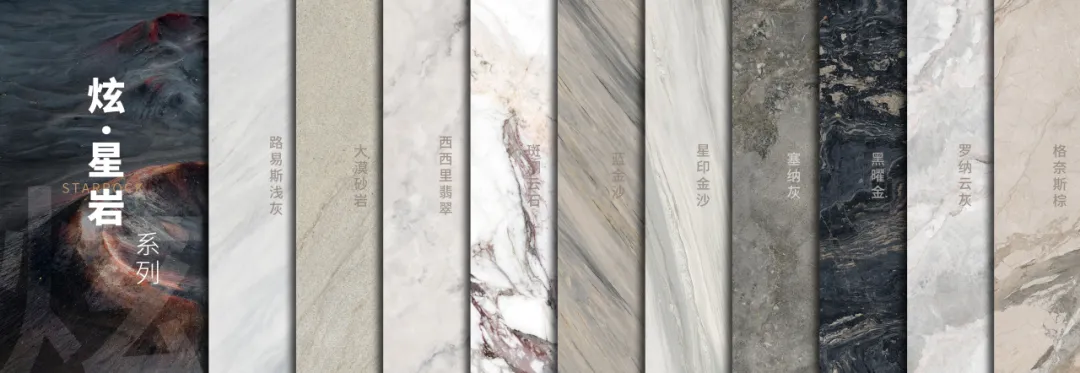 其中,炫·星岩系列以流动的星空、稀世矿石脉络为产品开发灵感来源,将星河的闪耀与矿石的厚重巧妙融合,采用先进技术还原高贵奢纹和璀璨流光,营造奢华、高雅的艺术氛围。