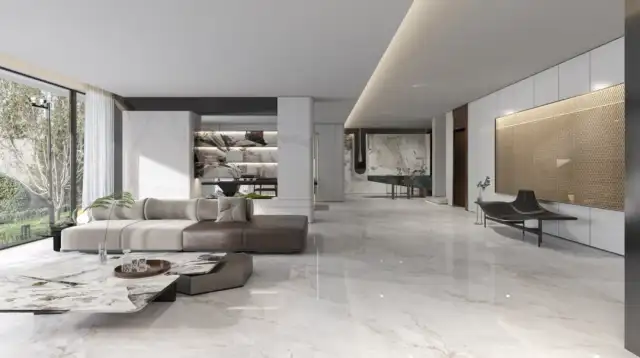 质感·原生石系列规格多样,除了传统的600×1200mm、750mm×1500mm规格,还有最符合视觉欣赏比例的1200mm×1800mm黄金规格,独有的釉面磨边工艺和超高的平整度可实现无限连纹铺贴效果。