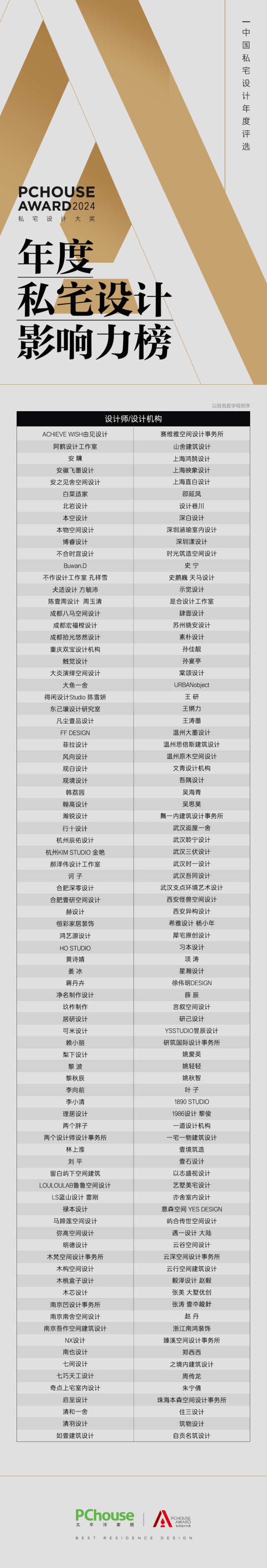2024年度,赛事根据整体参赛设计师区域分布情况,本着客观、精准以及最大化发掘优秀私宅设计力量原则,基于参赛设计师的作品质量、作品数量、团队实力、作品落地能力、消费者口碑、全网舆情等维度,PChouse Award私宅设计大奖评选出2024年度私宅设计影响力榜。恭喜获奖的设计师们。