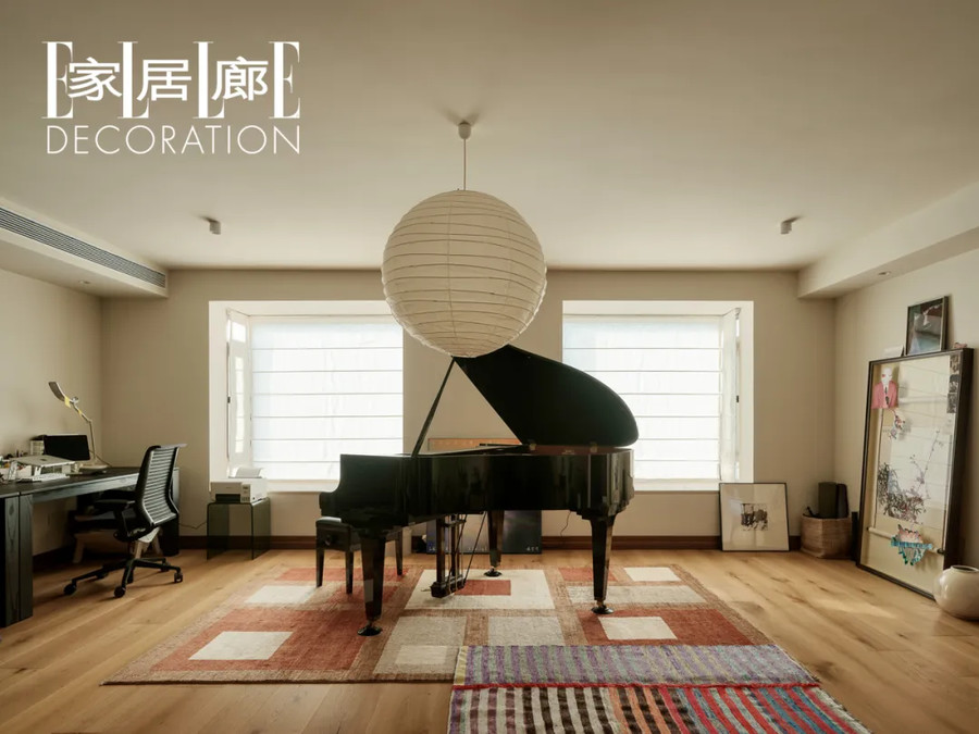 钢琴是空间的主角,两扇对称的飘窗引入大量光线。地毯是黔东南苗族的裂织布,吊灯是野口勇的vitra akari。