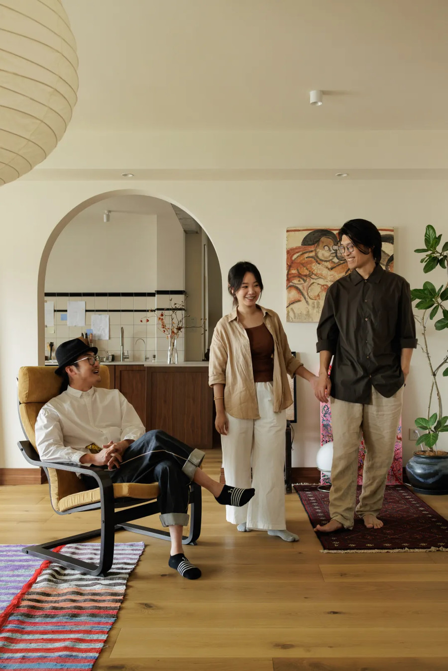 女主人曹地(中)留学英国归来,从事金融行业,工作之余经营着自己的家居生活类媒体账号。她热爱手工艺、热爱烘焙、热爱绘画创作和民族乐器……在她身上融汇着金融精英的理性与美好生活所带来的蓬勃生命力。
