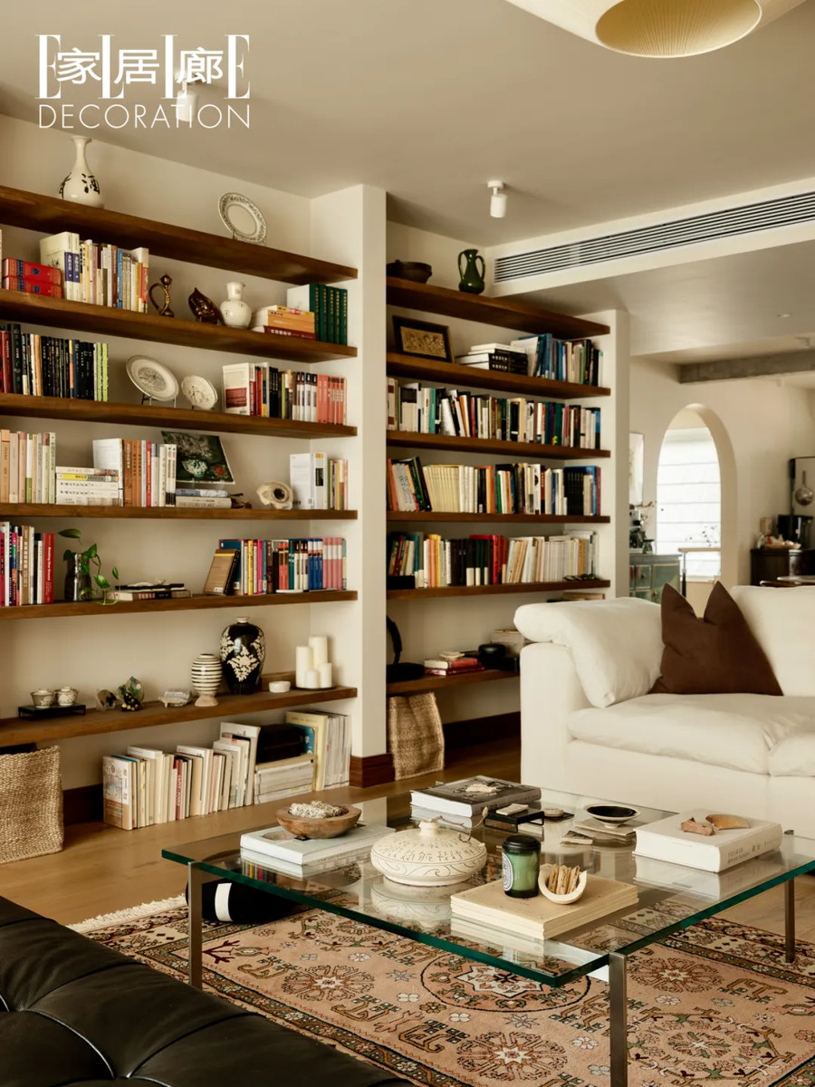 书架搁板是楸木制成的,为了让它与家中的色调更协调,曹地和张肖其亲自动手,用木蜡油将木板涂刷成了深色。