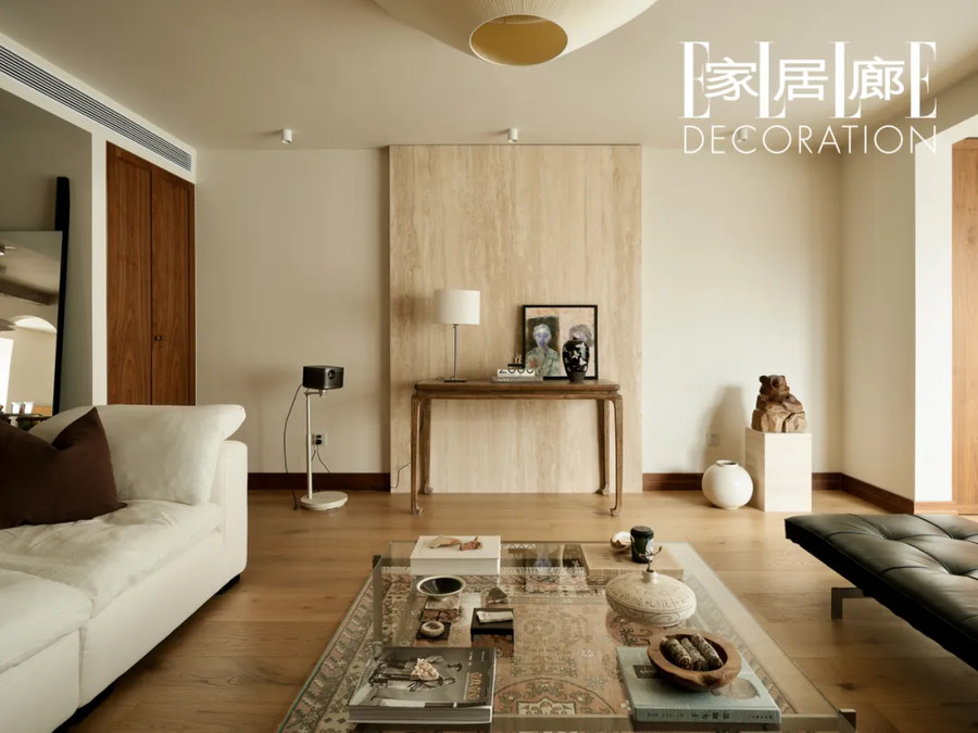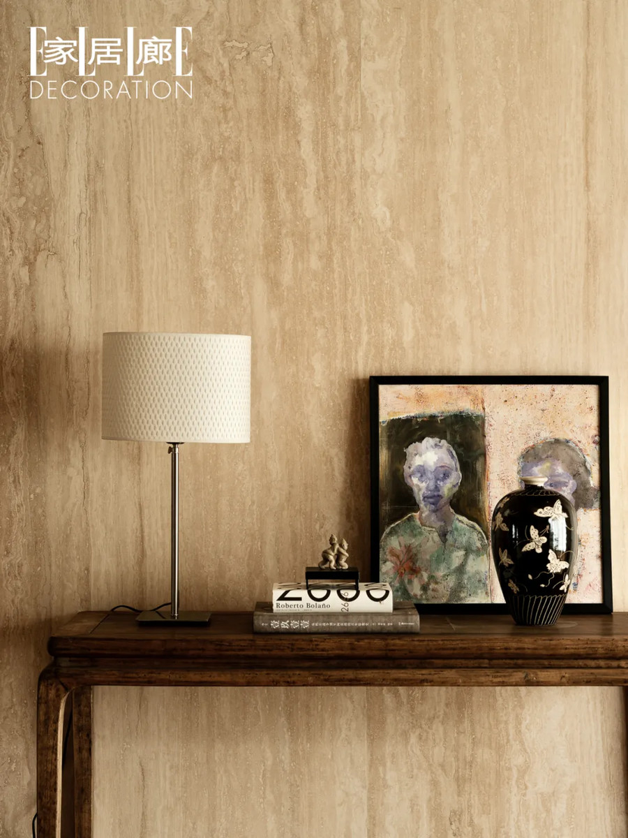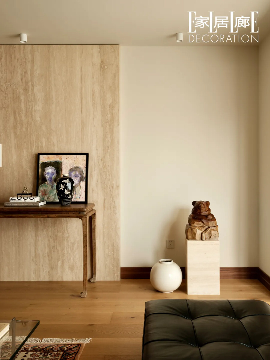 用土耳其洞石制成的背景墙。石材是夫妻二人从天津石材厂家淘来的,做背景墙后的边角料被DIY成了家中各种装饰品,包括右侧小熊雕像的底座。边几是淘来的清代早期的条案,画作是西安美院一位在读学生的作品。