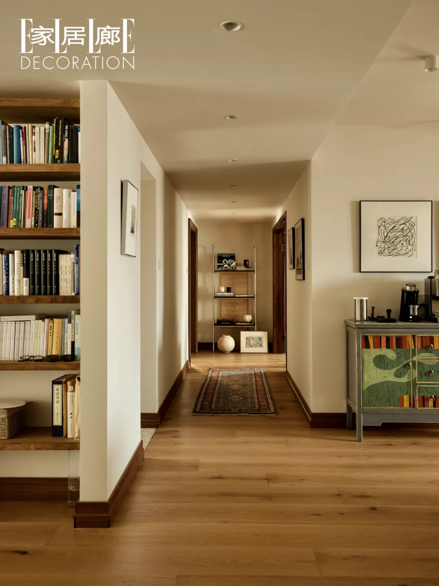 △走廊左侧是两间卧室,右侧半开放式的格栅连接着多功能区。走廊尽头的置物架用洞石背景墙切割的边角料装饰着,这样变废为宝的“二次创作”在这个家中比比皆是。