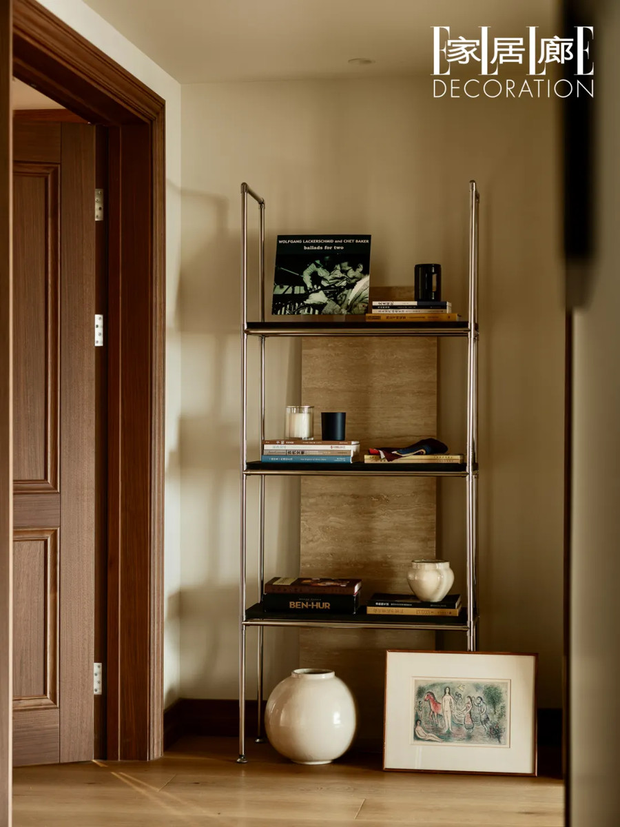 客厅书架对面的墙壁,装饰着一块价格不菲的土耳其洞石,裁切成合适的尺寸后,还剩余一些边角料,两个巧手的人将它们“变废为宝”,做成了很多装饰品,有的用于改造走廊尽头的置物架,有的则作为花器的底座,每一块都不浪费,恰如其分地成为了家的一部分。