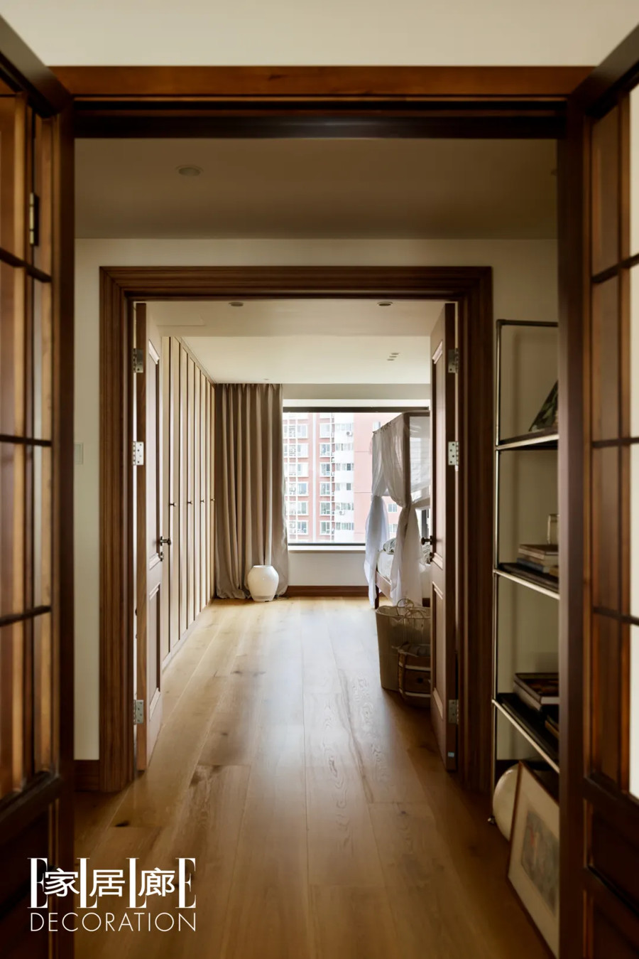设计师扩大了卧室的面积,以避免局促感。双开门的设计让它更具仪式感,也有更开阔的感觉。