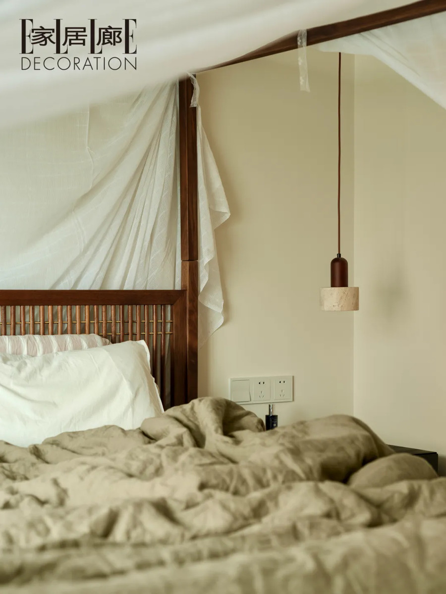 设计师扩大了卧室的面积,容纳了一张大尺寸柱床,打开舒适的尺度。