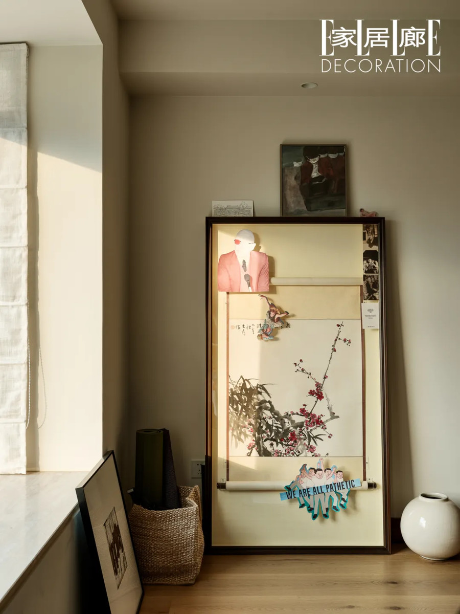 刘大为的画作,上面有曹地儿时随意涂画的痕迹,张肖其觉得很有纪念意义,便在新家为它保留了一席之地。由于担心挂在家中太过古典,二人特地为它定制了画框,并DIY了很多剪报装饰,进行二次创作,让它具有自己的生活痕迹。