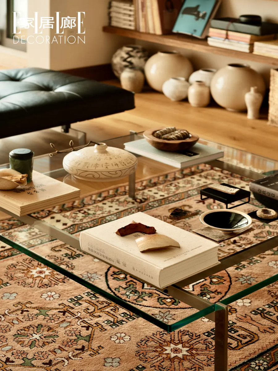 茶几上陈列着很多收集来的瓦片和瓷器,有的瓦片经过二次创作成为了家居装饰品。