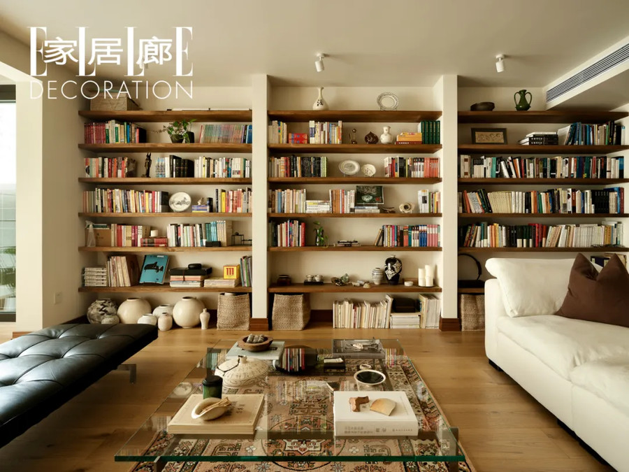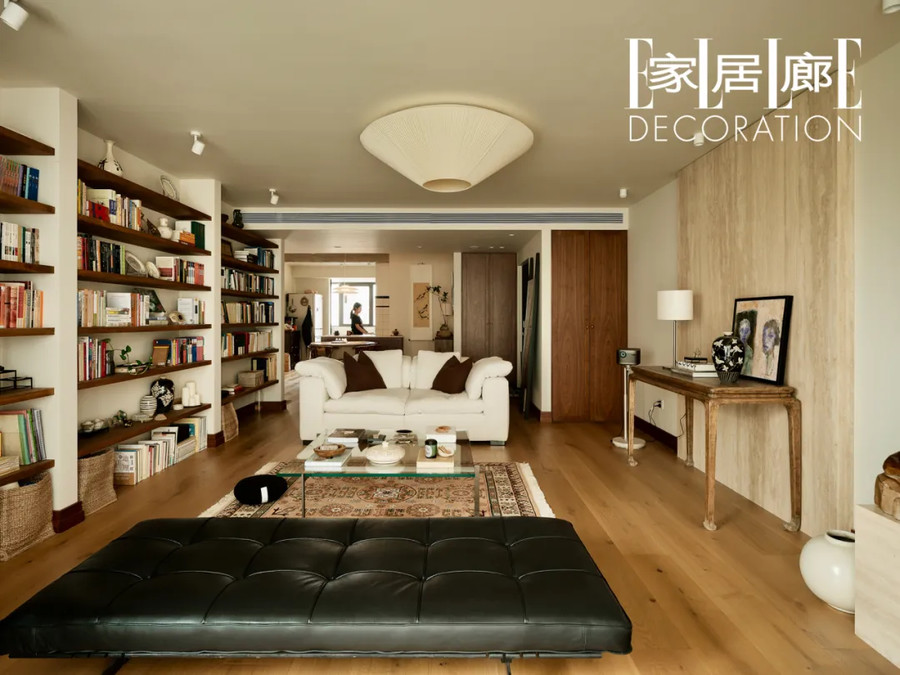 于是这个原本规规矩矩的160㎡四室一厅,在单国晏的改造下,变成了两大生活区加两间卧房的结构。生活区一个以“书”为主,7米长的开放式书架沿着墙面展开,沙发和躺椅沐浴着落地窗的阳光,安静从容;另一个区域以“乐”为主,钢琴是空间的焦点,一侧是夫妻二人的工作区,角落里摆放着唱片机和各种乐器。