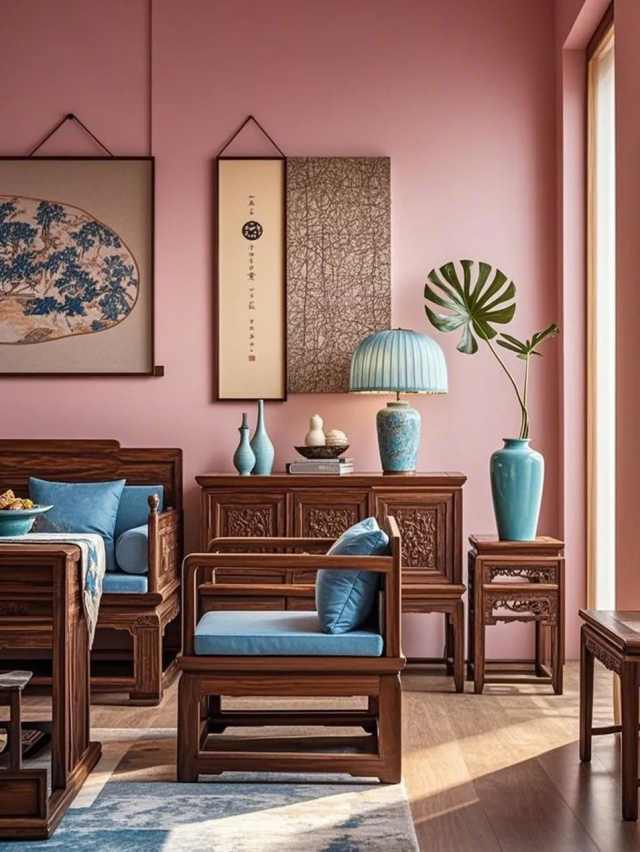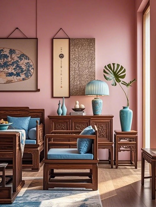 用粉色作为墙面拥抱整个房间,棕色做地板或木制家居,蓝色作为装饰或织物,产生一种宁静的磁场,营造一种温馨而又不失深邃的氛围。