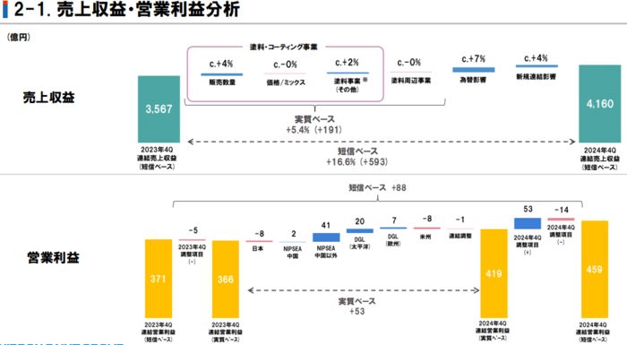 财报显示,立邦涂料2024年第四季度实现综合销售收入为4160亿日元,同比增长16.60%,增长主要是由于销量增加、汇率影响和新合并的影响。由于数量增长和产品价格上涨,DGL(欧洲)以外的建筑涂料业务销量有所增加;汽车方面,由于主要来自日本汽车制造商的产量,日本和美洲的销量下降,而中国的销量增加。营业利润为459亿日元,同比增长23.6%,由于销售收入增长效果和销售管理费用率的抑制等原因,计入了部分AOC收购相关费用。