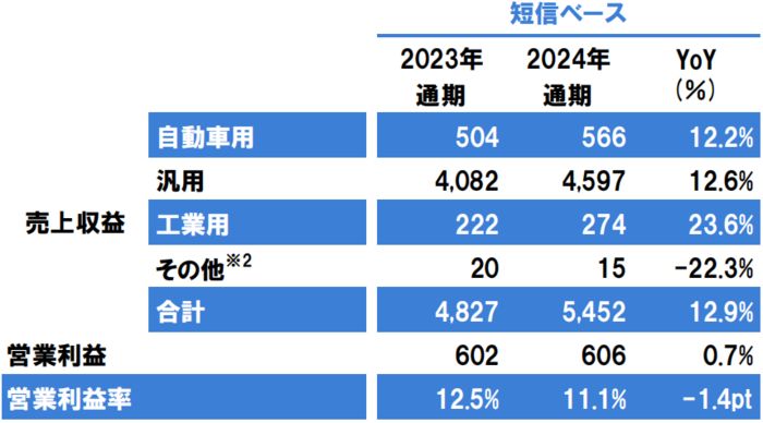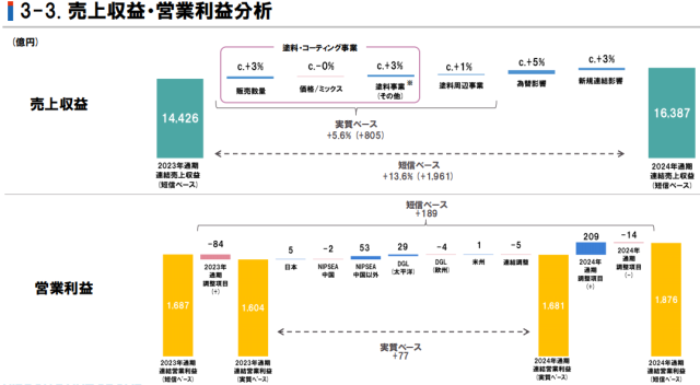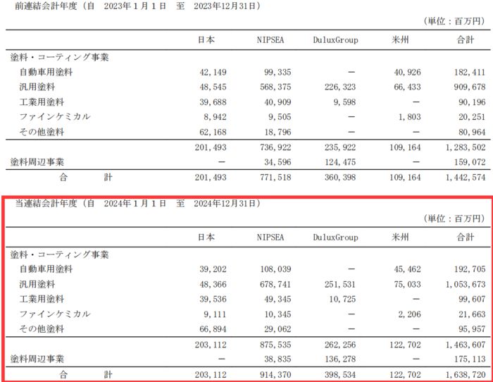 通用涂料的销售收入高于上一年度,尽管由于太平洋和欧洲市场疲软,销量增长缓慢,但也受到日元贬值的影响。尽管受到市场疲软的影响,涂料周边业务的销售收入仍受到太平洋业务收购以及2023年7月完成收购的欧洲涂料周边产品制造商N.P.T.由于s.r.l.的业绩贡献,超过了上一年度。因此,该部门的合并销售收入为3985.34亿日元,同比增长10.6%;合并营业利润为403.74亿日元,同比增长16.6%。