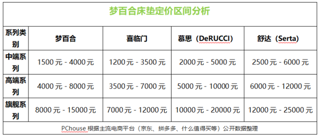 据企业资料,梦百合主推的床垫产品分别有三大系列(中端系列、高端系列、旗舰系列),全系列产品的定价区间在1500-15000左右。