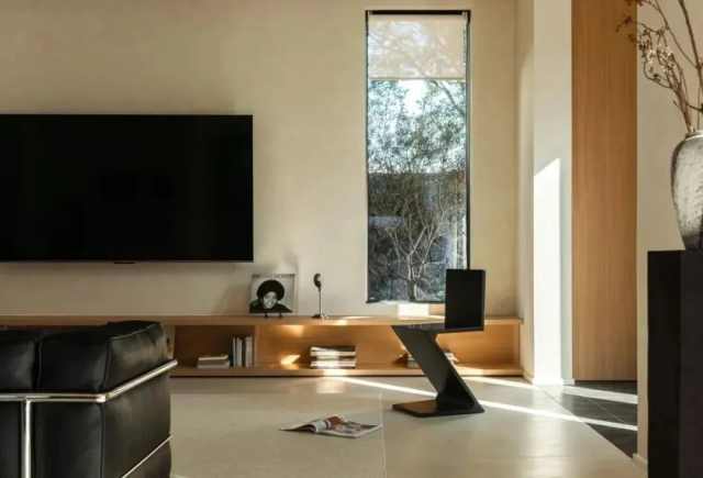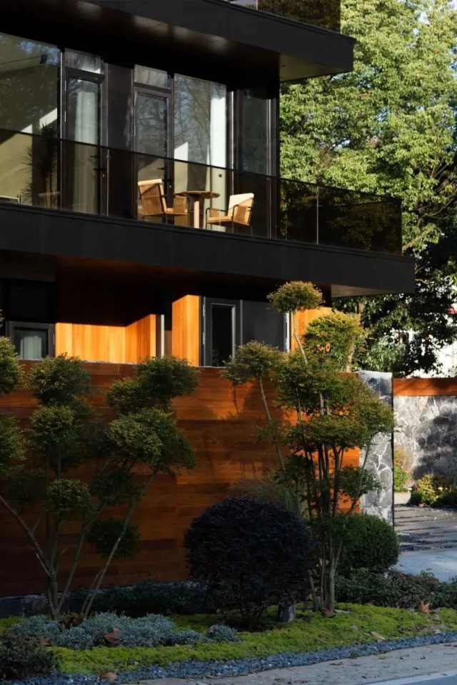 别墅位于山谷之中,设计师在建筑外观上特别注重与周围自然景观的融合。外墙选用了灰色砂岩和天然柚木,质朴而富有质感,黑色铝板的线条则为其增添了一抹现代气息,既不突兀,又显得精致优雅。建筑的整体风格既尊重自然的原始美感,又融入现代设计的简约与实用。