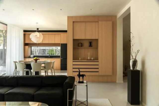 一层是业主父母的日常居住空间,包括客厅、餐厅、厨房、冥想室和主卧套间。设计师通过中轴的承重墙将动区和静区巧妙分隔:客餐厨属于动区,适合日常活动;卧室和冥想室则位于静区,提供了安静私密的休憩空间。