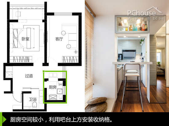 厨房面积很小,但收纳柜子一件也没少。餐厨一体化,没有设置独立的餐厅,而是打造了一个休闲吧台,一日三餐都在这个小角落里轻松解决。