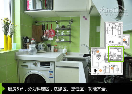 女主人自诩为“吃货”热爱烹饪。但是厨房只有4㎡,有些施展不开手脚,那么就要在厨房收纳上下功夫:可以利用边角空间,设计小型橱柜、墙面工具架等,最大程度减少空间浪费。
