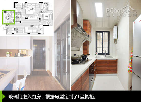 厨房不足6㎡,根据需求向木工定做一套橱柜,比去品牌定做便宜,还更实用。厨房用玻璃推拉门引入更充足的光线。