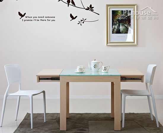 【太平洋家居网 卖场频道】现代简约的家居是年轻时尚中不可缺少的格调。年轻人喜欢淡色,因为淡色可以让生活变的更加清新淡雅,仿佛象征着新的生活,充满了无尽的向往。同样也给生活带来了不一样的宁静清新之情。小编今天带大家欣赏一张白橡色的小户型简约家居 ——开合玻璃餐桌。