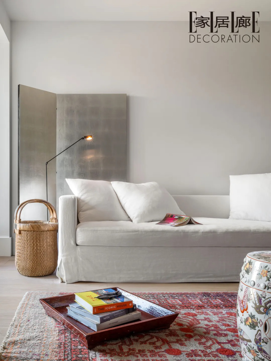 沙发是从西班牙远渡重洋运输到家中的,二人非常喜欢白色的亚麻面料的自然褶皱。沙发后的屏风是这对设计夫妻自己设计,找工厂定制而成的,这是他们对家具设计的一次成功尝试。