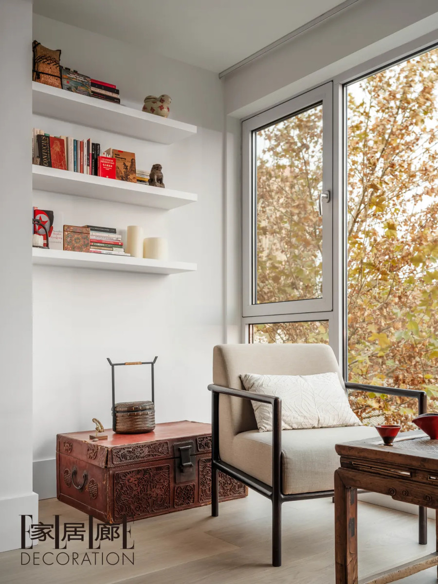 书房窗边放置了一个老门扇改装的屏风,飘窗上陈列着各种造型的白色瓷瓶,都很干净素雅,没有任何图案装饰。