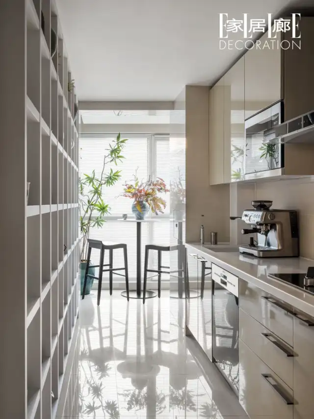 厨房是狭长的一字型结构,尽头摆了一张小小的圆桌和两把吧椅,有时两人会在这里吃早餐。