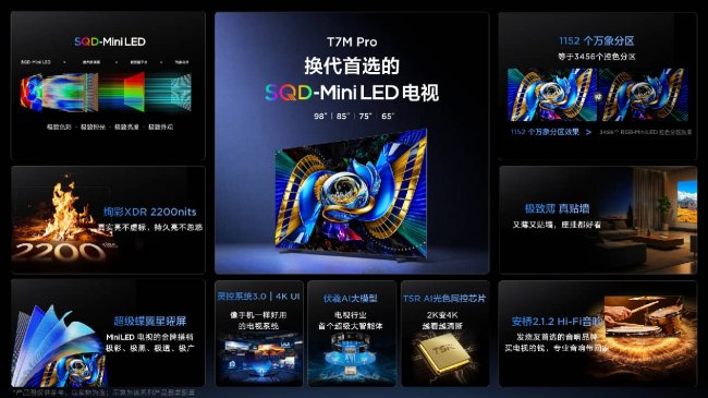 T7M Pro作为定位换代首选的SQD-Mini LED电视,实现了对同价位段产品的“跨代技术碾压”,堪称电视换代的闭眼之选。该机在主流价位段率先采用SQD-Mini LED技术,其100%BT.2020全局高色域较普通Mini LED领先一个代际。1152个万象分区的分区数量等同于RGB电视3456分区,配合绚彩XDR 2200nits亮度,在色彩、对比度与亮度上形成全面优势,实现对同级产品的技术降维打击。此外,它还升级了超级蝶翼星曜屏、安桥2.1.2Hi-Fi音响、TSR AI光色同控芯片及灵控系统3.0,确保使用体验无短板。