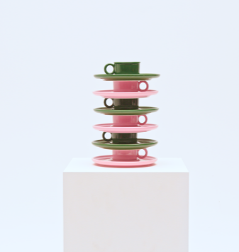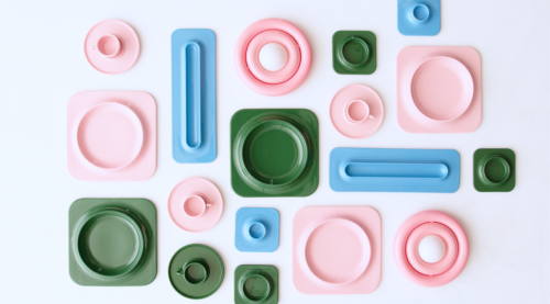 该系列餐盘提供深绿色与粉色两款,方形外框搭配圆形内凹,形成鲜明视觉反差。每只餐盘既独立成型,又可拼接组合,宛如马赛克般构成统一的餐具家族。