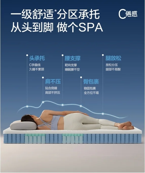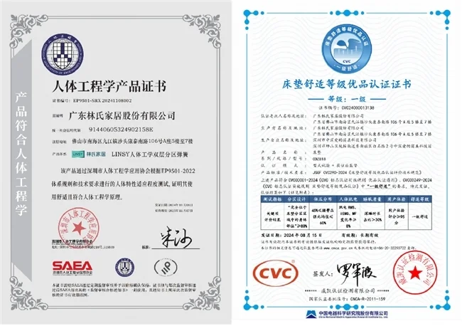 因此,林氏家居意识到与其“内卷”分区的数量,倒不如在把研发精力集中在5区功能的差异化上——区别于传统的5等分方式,林氏家居经调研发现成年人身高差异主要在腿部,而上半身的差异比例不到30%。人体在躺卧时所需要的支撑需求差异则集中在肩部、背部、腰部、臀部几处,因此传统等分反而会导致支撑错位。为此,品牌基于样本数据与权威测量,精准界定各分区的分布位置及弹簧软硬程度。经权威检测,其床垫分区准确性超 80%,不仅有效提升支撑分压性能,使睡眠深度提升30%,更获得深圳市人体工程学应用协会颁发的人体工程学产品证书以及经CVC威凯检测后颁发的“一级舒适”认证证书。