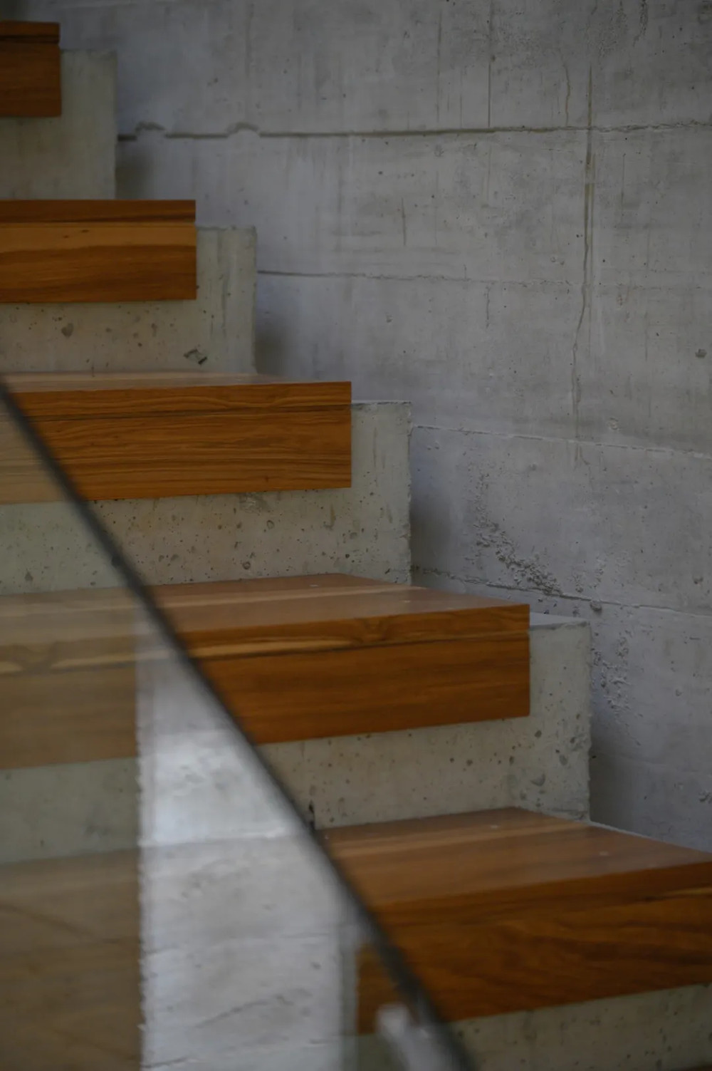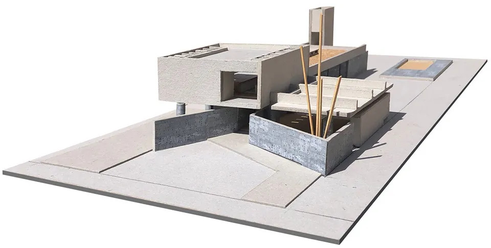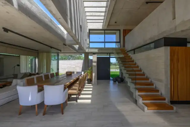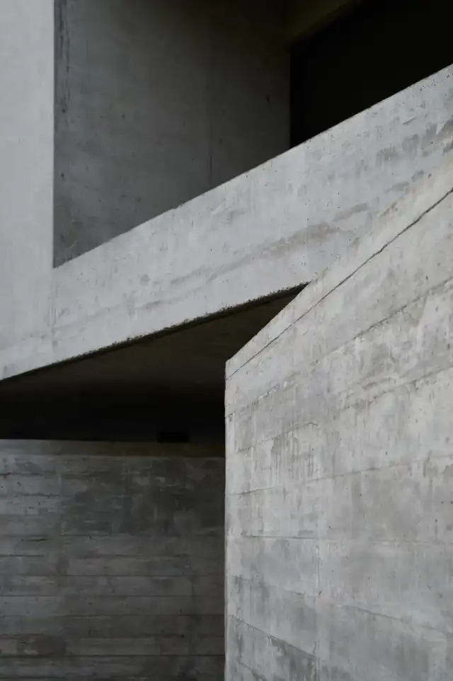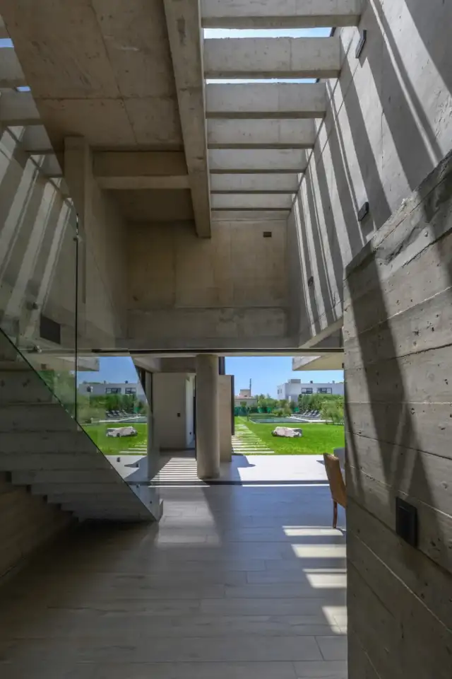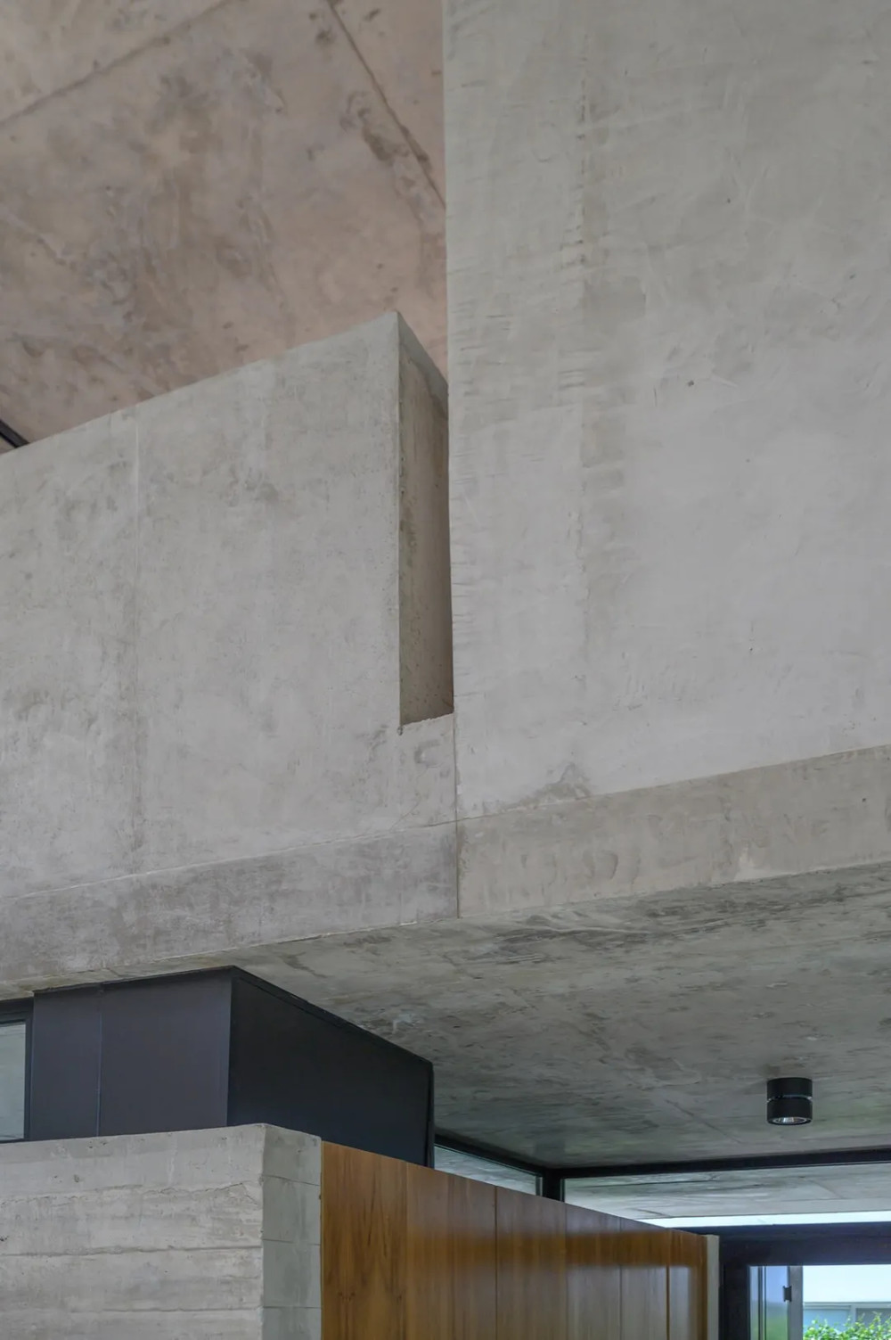 入口设计由两面墙体围合,一面隐藏了室内光庭,另一面遮挡了车库。行人入口位于一侧,沿着两面带有肌理的混凝土墙之间的对角路径进入,并通向第二道墙。而车辆及服务入口则位于另一侧,其下方形成一个开放空间,使建筑最厚重的部分悬浮于上方。设计通过偏移支撑结构与流线布局,创造出一种轻盈与视觉上的无重感,同时暴露出所有的结构元素。这种动态关系也体现在覆盖餐厅区域的楼板上,其中三根倒置梁沿一个方向布置,另一根横梁悬挂以支撑廊道,试图在前后庭院之间建立最流畅的空间联系。