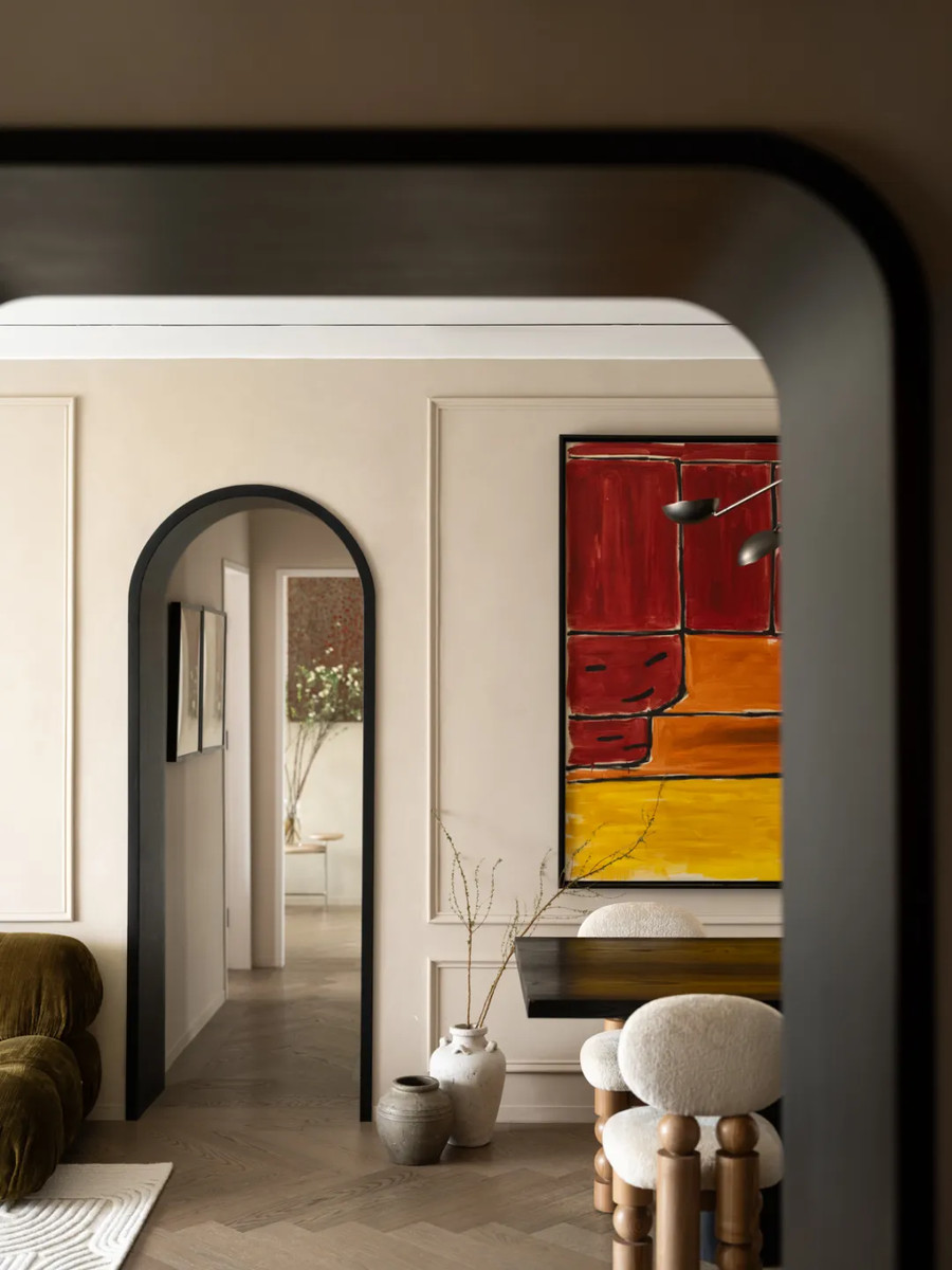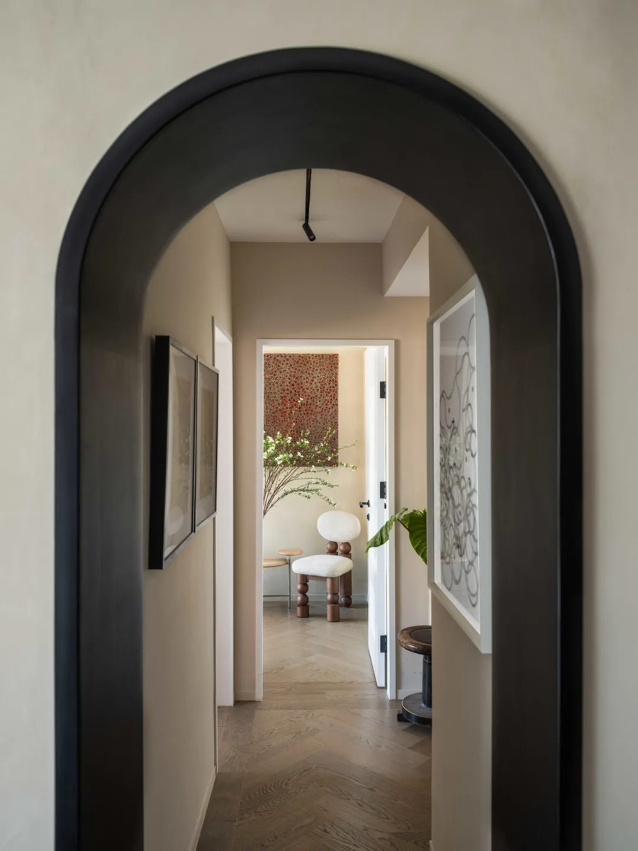 透过玄关的方拱形,一眼便可望到更具弧度的走廊拱门,各区域之间的联系带着微妙的有趣,使人在不同角落驻足,能够看到不一样的风景。走廊左右两侧的画作分别来自Andy Warhol与Ronan Bouroullec。