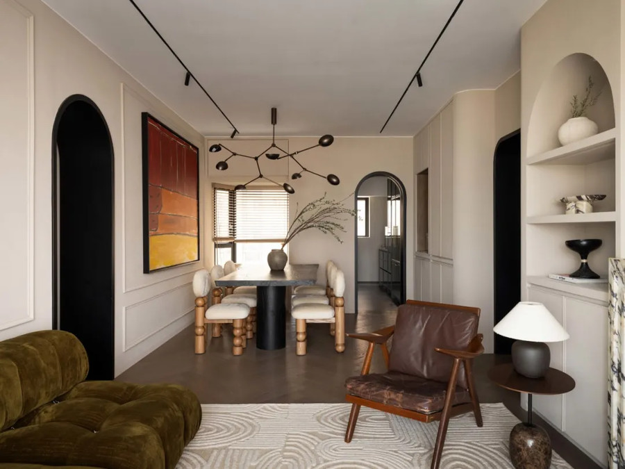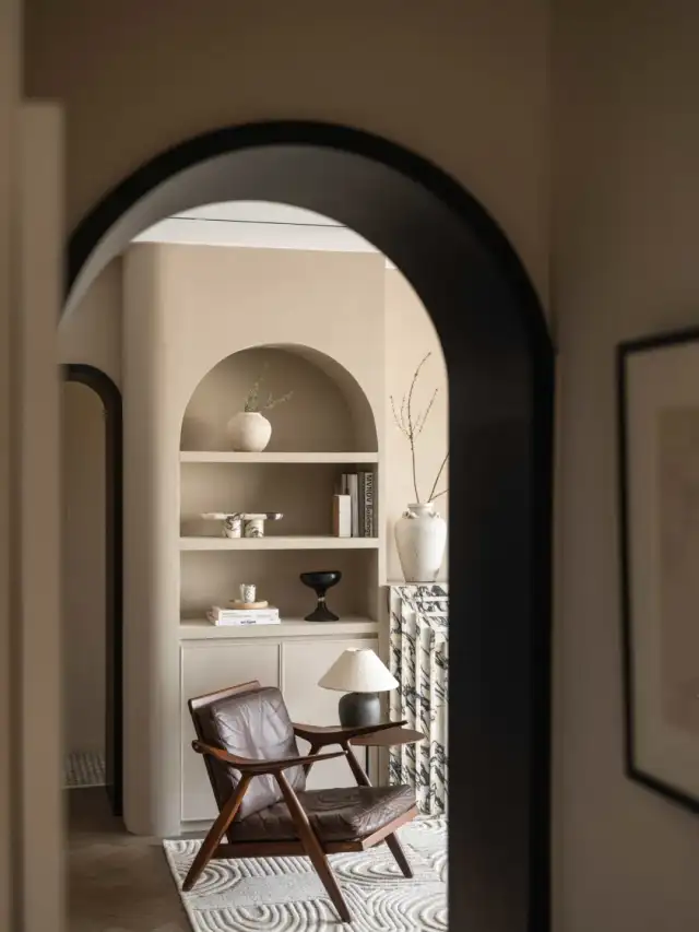拱门的造型简洁大气,与整体设计风格相得益彰。它不仅是踏入这个家的第一道风景,更是贯穿全屋的核心元素,反复出现在各个角落,将各个区域紧密相连,相互映衬,共同构建出一个和谐而统一的空间格局。