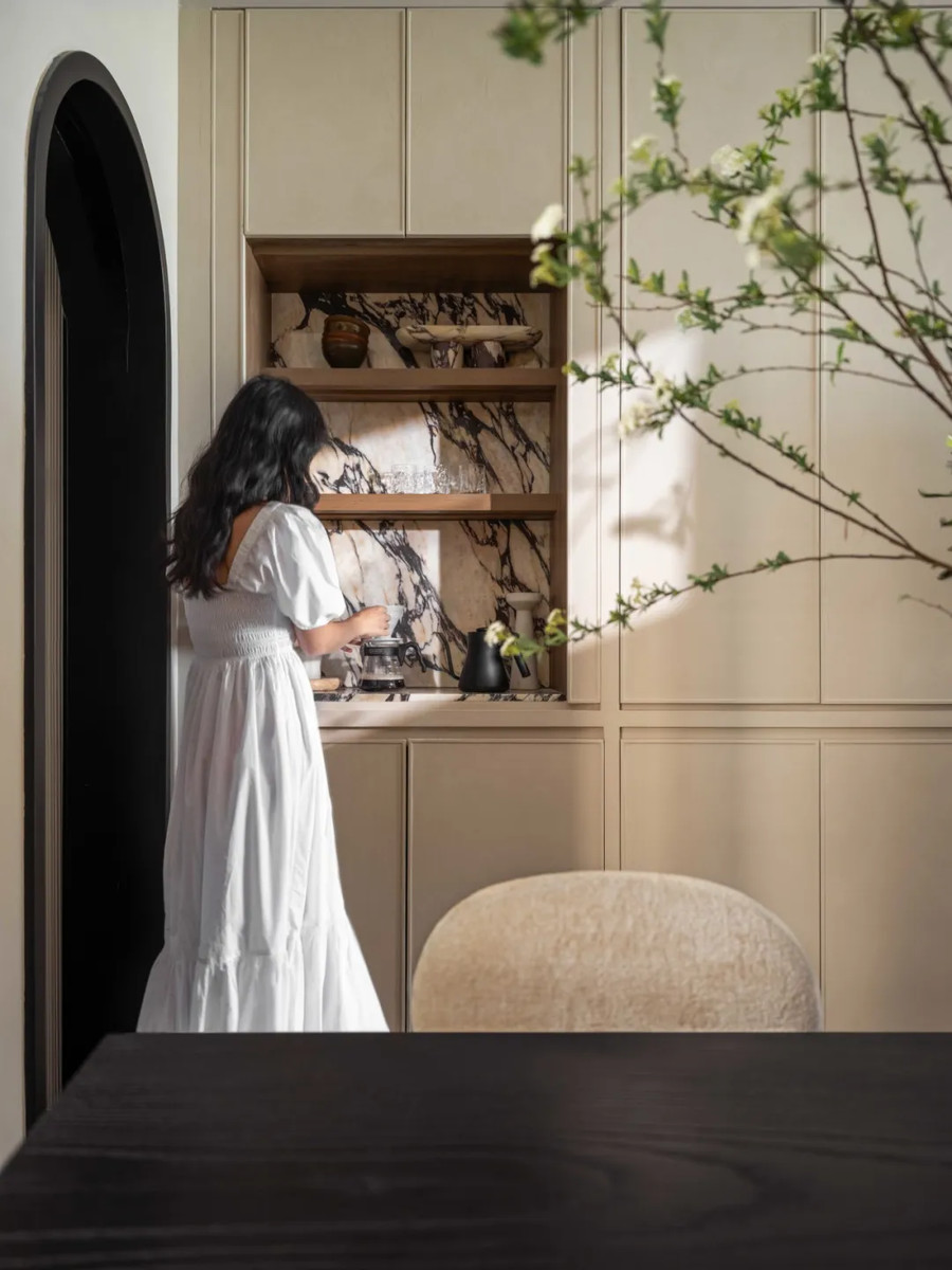 随着生活阅历的愈加丰富,以及新的家庭成员到来,这处居所呈现出人生新阶段的样貌。永不过时的亚麻色调,大理石、陶、木等更温厚、自然的材料,如同过往在岁月的流转之中,沉淀出新意。