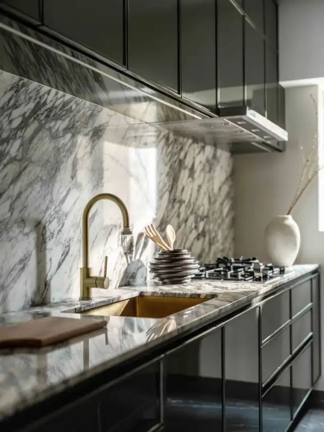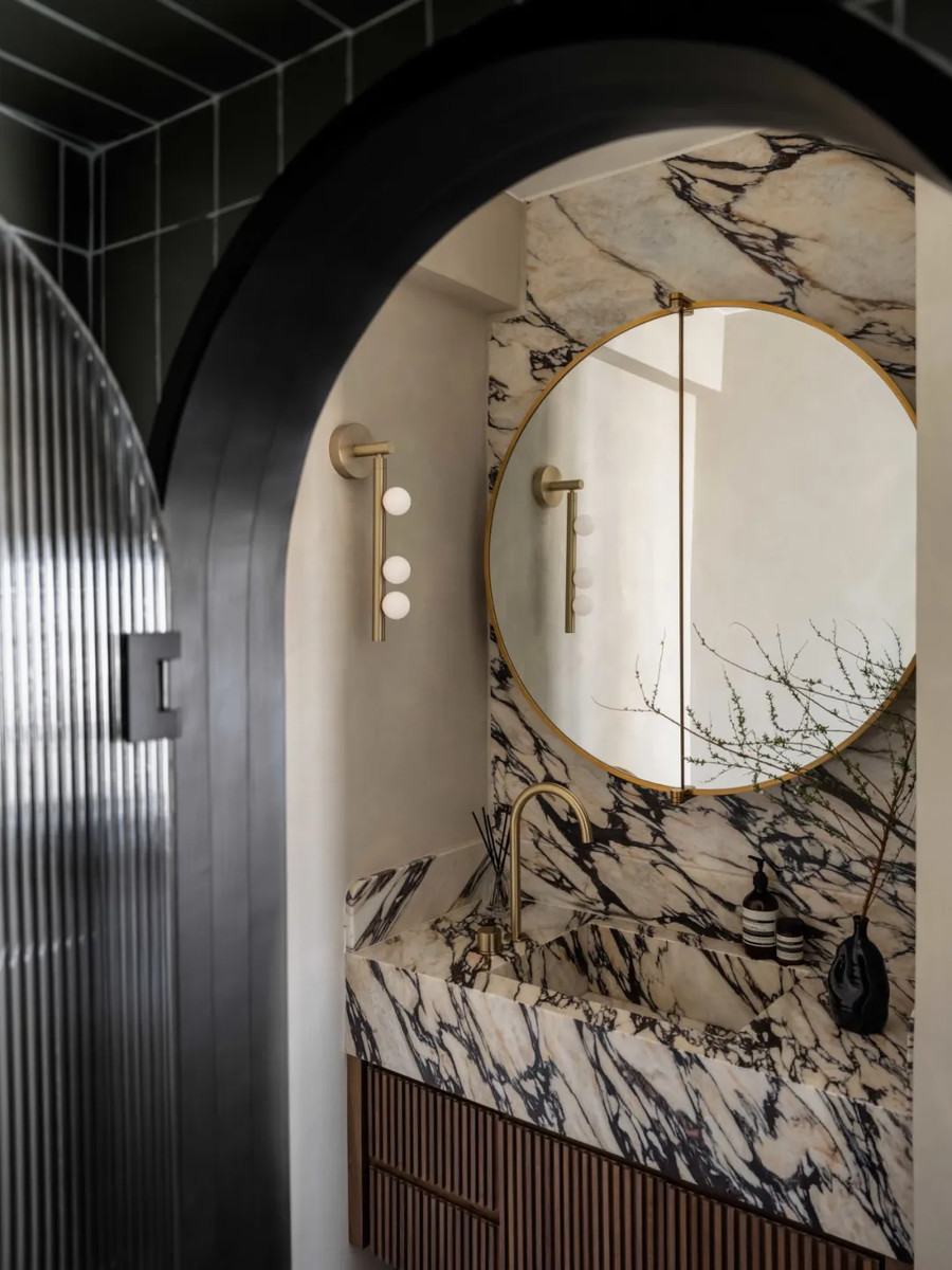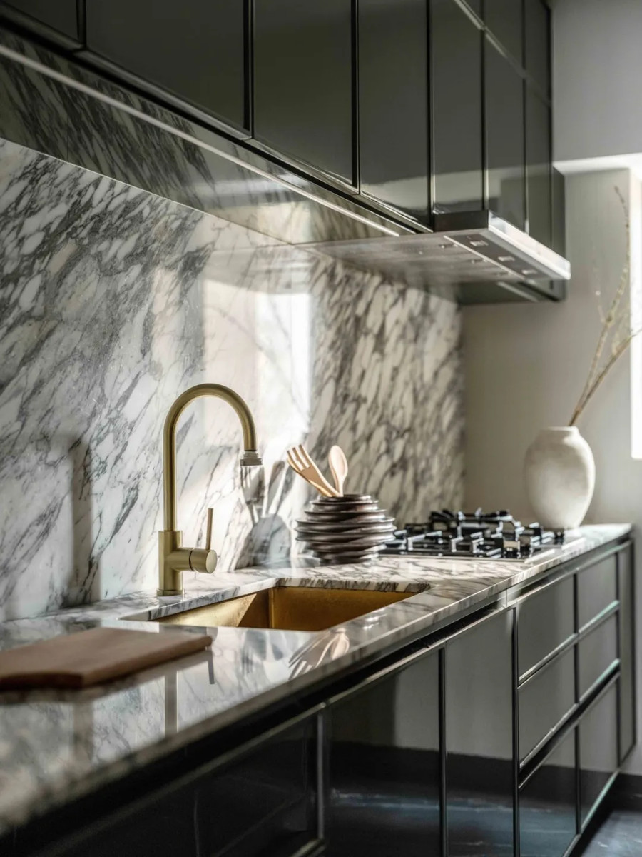 踏入厨房,首先映入眼帘的便是优雅的大理石台面,天然的纹理展现出独特的质感。与之搭配的,是极具质感的深鼠尾草绿色橱柜。独特的色彩,如同宁静的自然之息,与大理石的冷峻光泽形成鲜明对比,却又在光影交错中相互映衬,被赋予爱与艺术的双重意义。至此,厨房不再只是烹饪场所,更是一个充满生活仪式感的艺术空间。