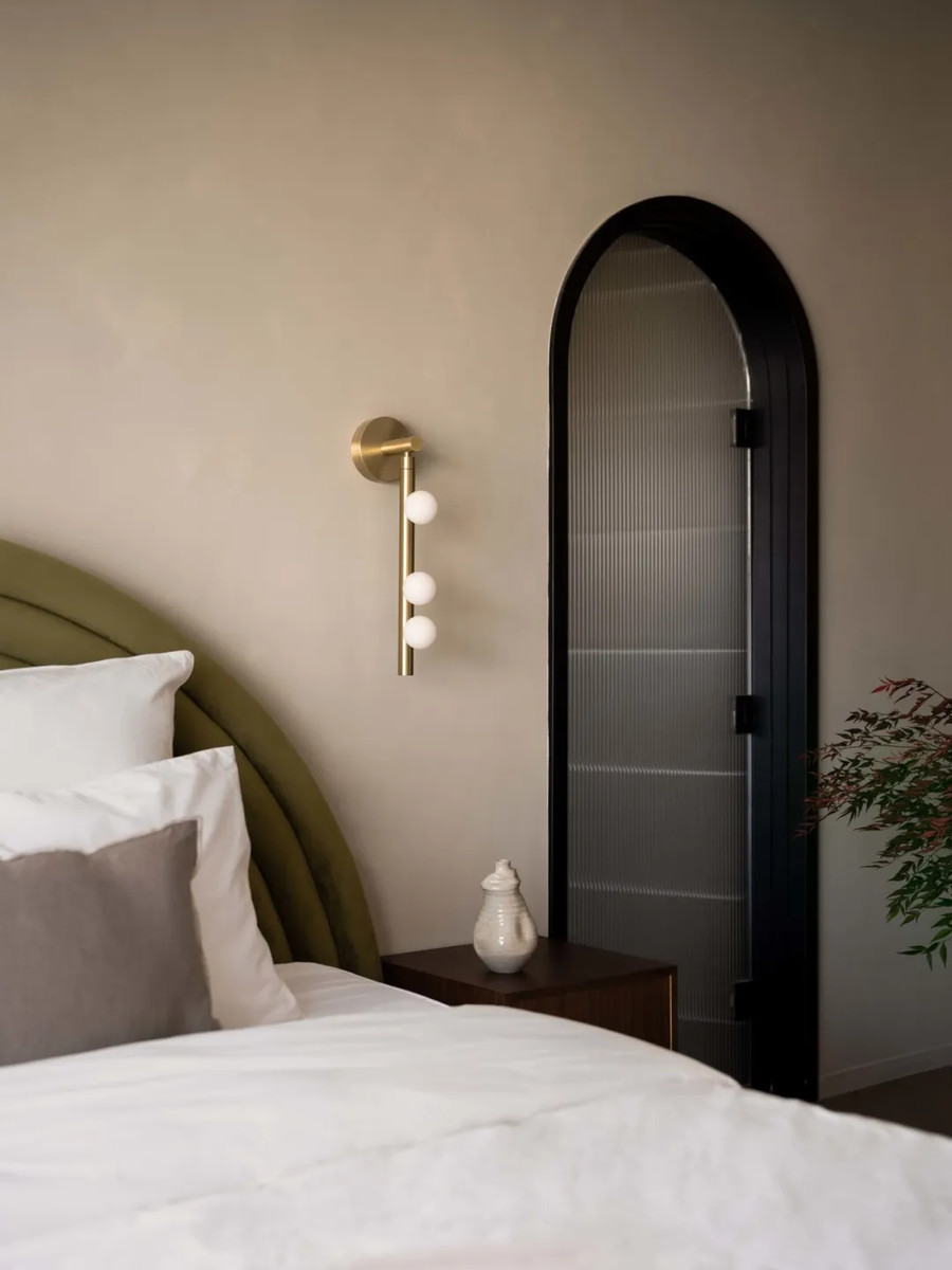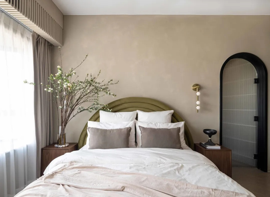 主卧室的设计更加注重宁静、舒适。Lim + Lu定制的绿色天鹅绒床占据了卧室C位,床头柜则选用了他们为丹麦品牌New Works设计的Mass系列,简洁的造型和精致的工艺与整体设计风格相融合,低调又不失活力感的金属壁灯,为空间注入另一抹灵动气息。