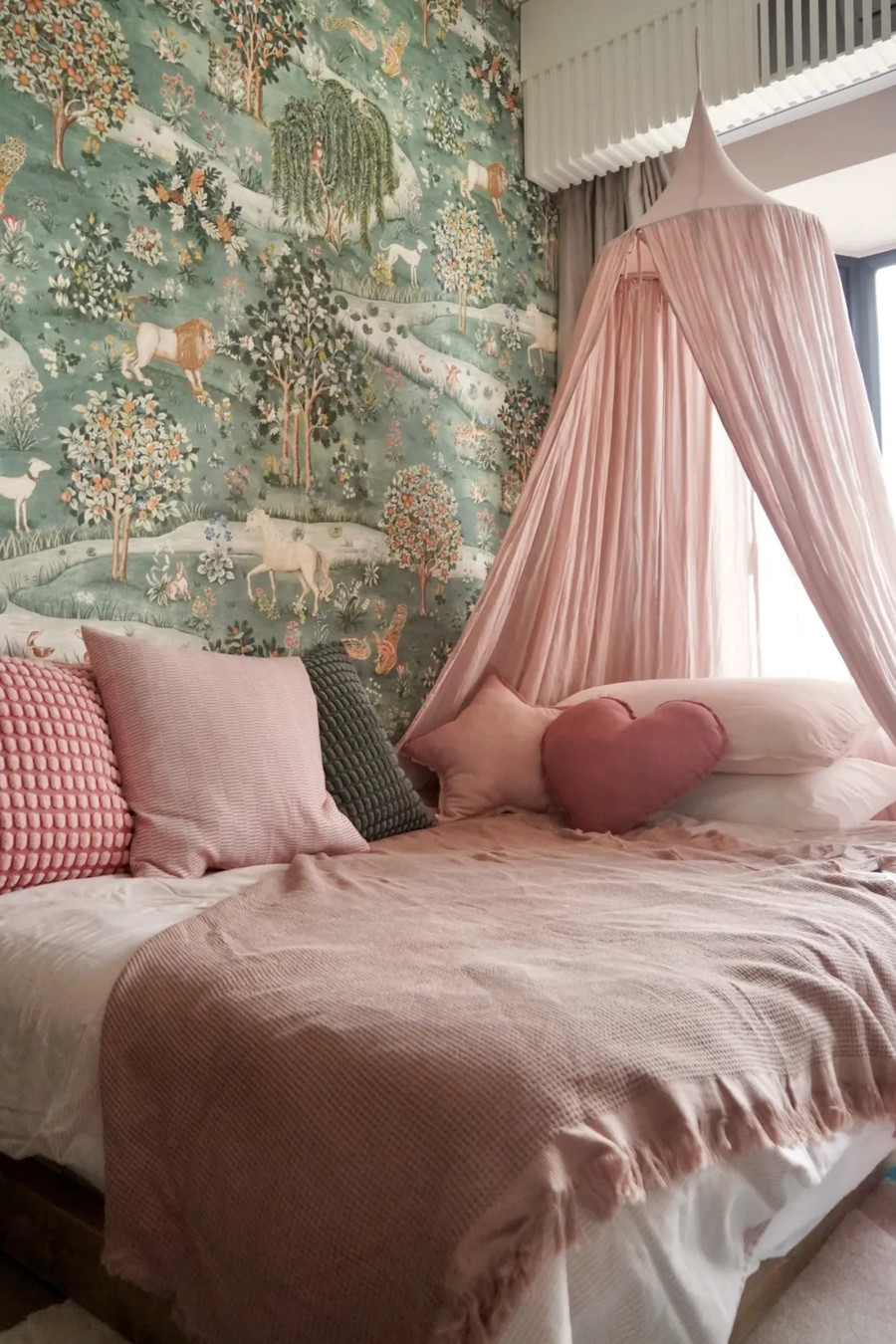 儿童房的设计中,充分尊重了孩子的年龄特点与个性喜好,打造了充满活力与柔美的粉色系空间。墙壁上充满童趣的丛林壁纸将大自然的奇幻世界引入室内,轻盈的帐篷式床幔则如同梦幻城堡,为孩子们的夜晚编织出瑰丽美好的梦境。