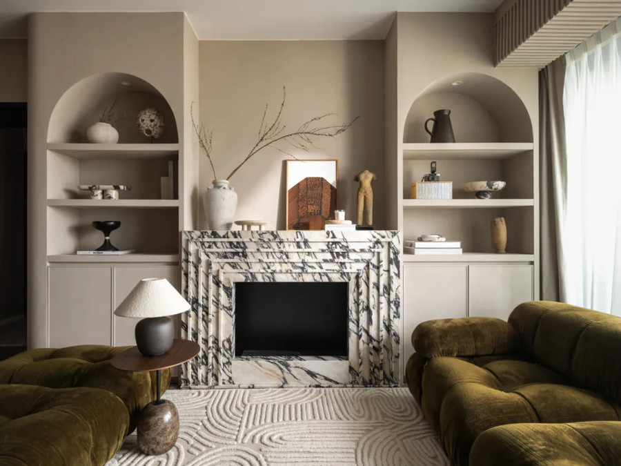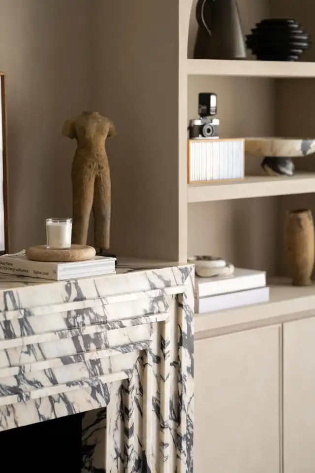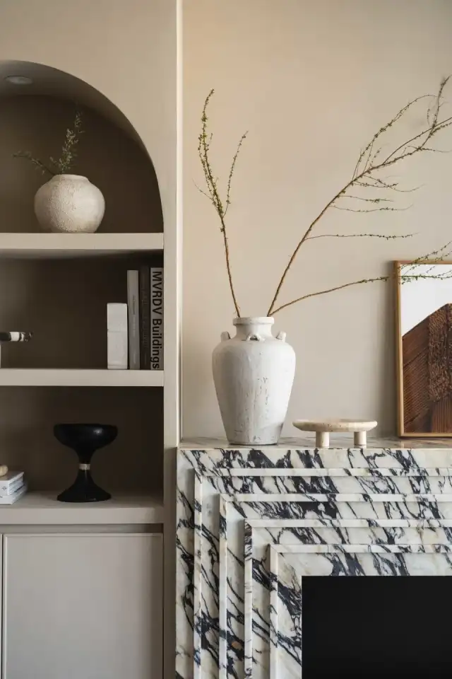 在壁炉两侧对称分布拱形壁龛,如同洞穴一般将夫妻俩的珍贵收藏悉数容纳,同时也起到展示的功用,Vincent将家视为“小型展览馆”,他作为家的“策展人”,将大大小小的物件精心放置在恰如其分的位置上,空间如同艺术气息自如流动的场域,滋养着居住者。